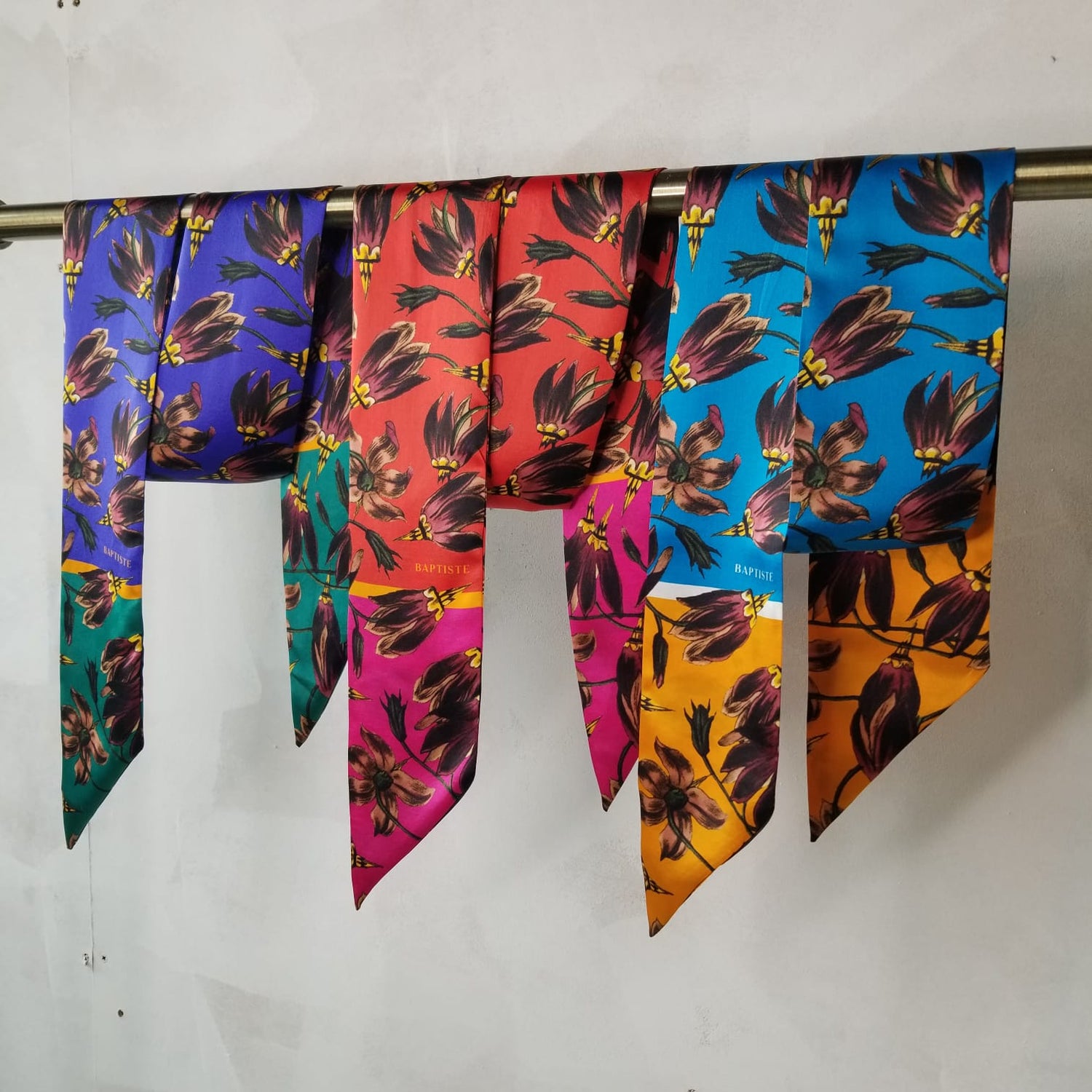 This Baptiste scarf has been made in England from smooth silk satin and digitally printed with the signature floral print motif. It's outlined by a contrasting saffron orange bold border, that really makes it pop. It's made from pure luxurious silk and printed in a variety of bold colourways. Using a vibrant colour technique to produce this iconic pattern, its generous colour penetration on both sides makes it perfect for tying at the nape of your neck or over the shoulder for a luxurious drape.